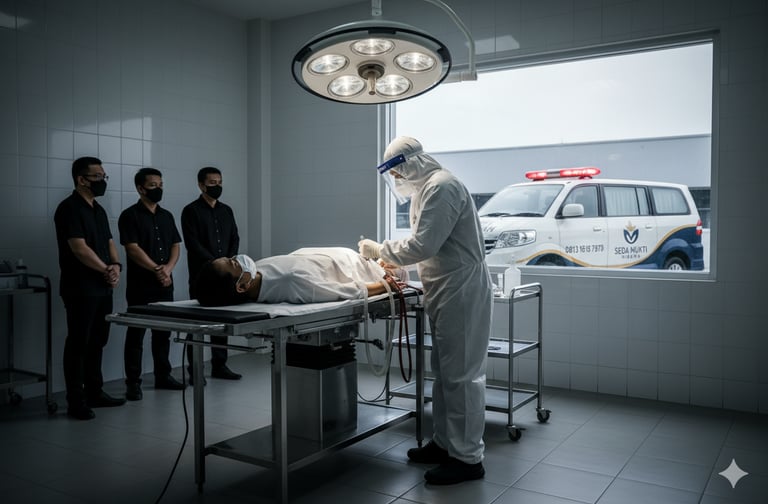 Sebagai penyedia layanan, kami memastikan bahwa setiap proses pemulasaran dilakukan oleh tenaga ahli yang terlatih, mengikuti standar operasional forensik yang ketat, dan menggunakan peralatan serta bahan kimia yang sesuai untuk mencapai hasil terbaik, baik dari segi higienis, pengawetan, maupun estetika.